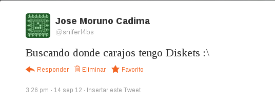 Y me la pase preguntando en mi casa vieron donde andan los DIskets xD todos me miraron con loco eso no hay hace tiempo, me dijeron asi que me la pase, y mientras andaba en la busqueda subi esta foto a mi twitpic http://subi esta pic subi esta foto a mi twitpic twitpic.com/aum13l.