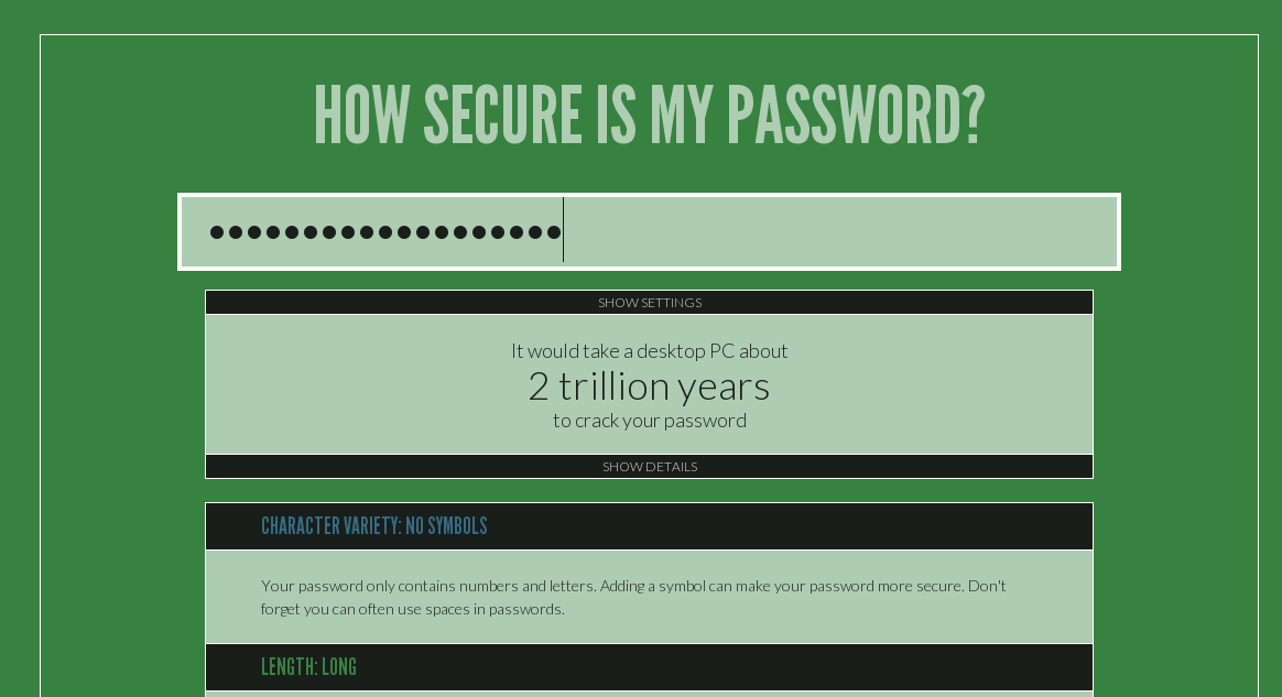 2 trillones de años para poder ser sacada por medio de fuerza bruta :) que es un tipo de ataque que tambien es usado o bien por diccionario lo cual creo que exista una identica en algun lado. (Nota: How Secure is My Password no se que tan segura sea y no almacene las contraseñas por lo tanto seria tener el debido cuidado)