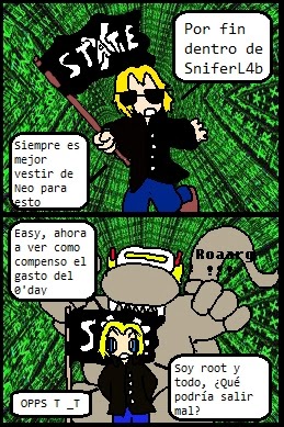 Hace unos días Snifer me comento la gracia que le hacían los dibujos que hacia para mi blog y me invito a que subiera una tira semanal en el suyo. Así que empecé a armar mis herramientas y a contactar con mis proveedores de 0’days rusos que me han costado bastante dinero, para poder hacer frente a la invasión a SniferL4b. Que como veis, ha salido a perfectamente ¿o no?