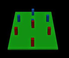 The image below is another representation of the scheme from above but with a camera behind the red team goalie. With a program that detects objects through the tones of pixels, the program would tell us that there are three objects, which would be only three players from red team of this picture. In the best case the program would detect the blue pixels and assume that there are three blue players, but this information would also be erroneous. We would get a similar impression if we put the camera on the benches where the players are.