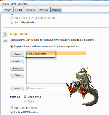Entonces esta configuración para identificar las respuestas que necesitamos filtrando, una vez que configuramos el ataque con intruder nos dirigimos a Options nos vamos a Grep-Match en el cual agregamos el termino que deseamos que valide, una vez que encuentre nos notifique.