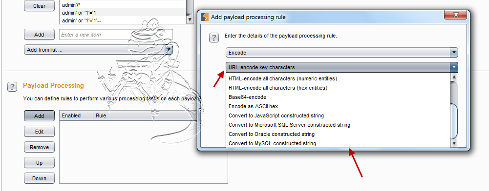 En el caso de existir algun tipo de filtro o control para los ataques que se realizen se debe de considerar lo siguiente la opción de Payload Encoding.