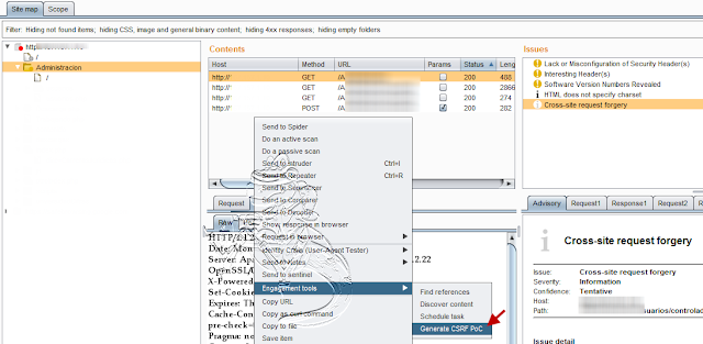 Posterior a la identificación de la debilidad nos dirigimos en donde se encuentra la debilidad por ejemplo si esta en el fichero index.php nos vamos a el y seleccionamos click derecho, engagement Tools y Generate CSRF Poc con el cual generaremos una prueba de concepto que nos permitira realizar el ataque.