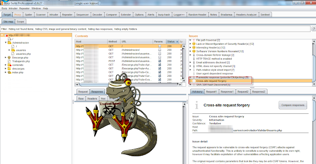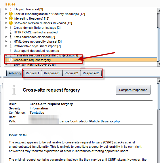 BurpSuite nos brinda la opción de identificar esta debilidad para posteriormente explotarla de una manera totalmente automática como recordaran una vez que se ejecuta el escaner ya sea de modo pasivo o activo va identificando las debilidades como se ve a continuación se identifico un CSRF.