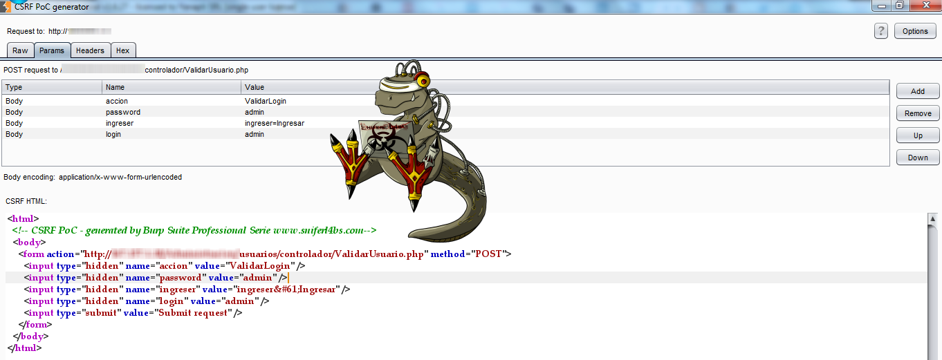 Una vez presionado tendremos lo siguiente como se ve se identifico el destino de la petición ademas de generar el código HTML como su nombre lo indica este es solo una prueba de concepto, un atacante llega a realizar un ataque dirigido clonando en su totalidad la aplicación