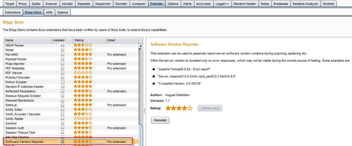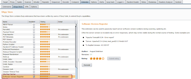 Como era de esperarse BurpSuite tiene un nuevo plus por así decirlo respecto a este punto y les hablo de una extensión la cual nos permitirá identificar de manera casi automática las versiones, sin necesidad de realizar la revisión manual para realizar la instalación nos dirigimos a Extender el Bapp Store buscamos Software Version Reporter e Install.