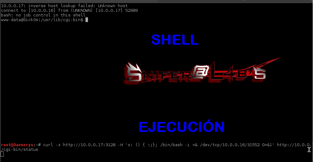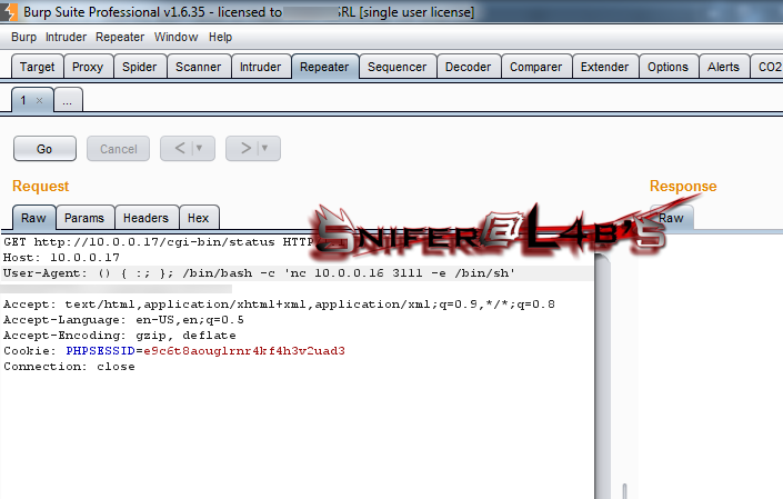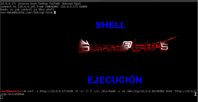 A la par BurpSuite con su analisis de vulnerabilidad que lleva consigo me identifico como posible ShellShock el directorio asi que trate de toda manera explotarlo desde el mismo BurpSuite pero por grajes del oficio no me dio, por cierto tengo pendiente explotarlo, pero se por donde debe ir ¬¬°. tras seguir probando e intentando como se debe explote de manera correcta, ya desde aquí la forma de explotar es la misma solo es cuestion de ver la manera de escalar siguiendo los pasos que vemos.