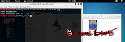 Ahora tenía ante mí dos imágenes. Aquí es donde más tiempo me tiré analizando, probando con detectores de técnicas EOF, LSB, y analizando de nuevo con un editor hexadecimal pero no saqué nada de ello. Entonces probé con la herramienta Steghide a ver si por casualidad me sacaba algún archivo, y afortunadamente la imagen dino.jpg me devolvió la primera flag que luego hubo que descifrar.