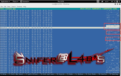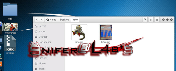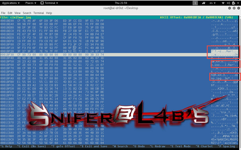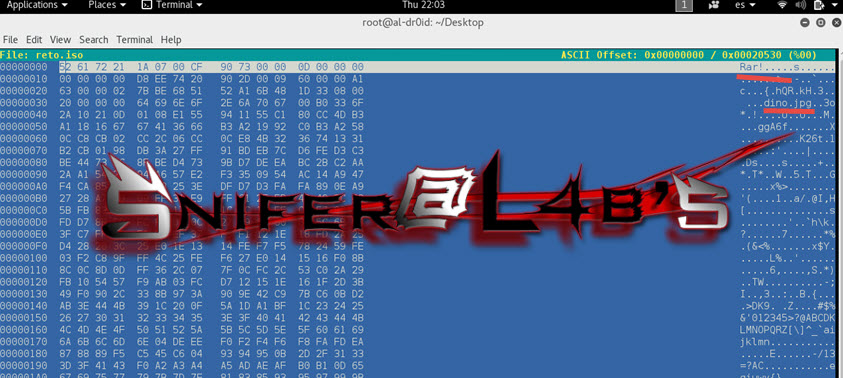 Una vez descargué la imagen la analicé con un editor hexadecimal en busca de cabeceras de archivos que no fueran las del jpg que teníamos inicialmente. Cómo no, encontré la cabecera de un bonito archivo .rar que Snifer había añadido con la técnica EOF y por tanto cambié la extensión del archivo y extraje su contenido.