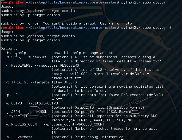 Una vez que tengan las dependencias instaladas ejecutan la aplicacion y tienen el siguiente resultado, si agregar -h recien tienen todas las banderas para trabajar como ven es posible hacer uso de un diccionario con el -s common.txt que llega a ser el diccionario de subdominios, y con la -t en el caso de contar con varios objetivos que se encuentren en un listado, ahora es posible exportar todo con el -o pero vamos que tienes que probar para entender la herramienta.