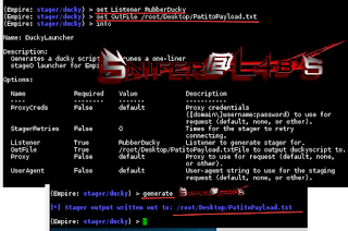 Notaran que al ejecutar el comando info en el framework nos da las opciones como lo tenemos en Metasploit con show options, si notan tenemos marcado el valor OutFile ademas de ello el Listener que debemos de especificar el creado con anterioridad en esta prueba es RubberDucky.