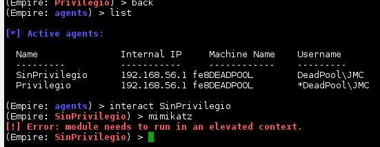 Lo primero que notamos es que si procedemos a ejecutar mimikatz nos dira que no tenemos los privilegios necesarios aqui viene al rescate EMPIRE con su módulo bypassuac que para el uso es bypassUAC y el nombre de nuestro Listner y veremos el siguiente mensaje el que esta en verde mas la generación de un nuevo Agente con un asterisco asi que este es el que tiene privilegios.
