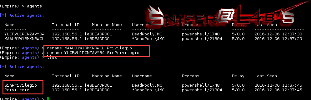 Aqui tenemos un pequeño problema, por decirlo asi el recordar cual de los dos agents que tenemos es el que tiene privilegios o no, en este caso no tenemos mucho por donde perdernos pero que sucede si tenemos mas de un agente como los diferenciamos uno del otro ya que existe la probabilidad que ejecutemos lo que no debemos en uno u el otro para ello tenemos la opción del RENAME el cual nos permite renombrar el nombre a uno más facil personalizable y descriptivo como vemos a continuación.