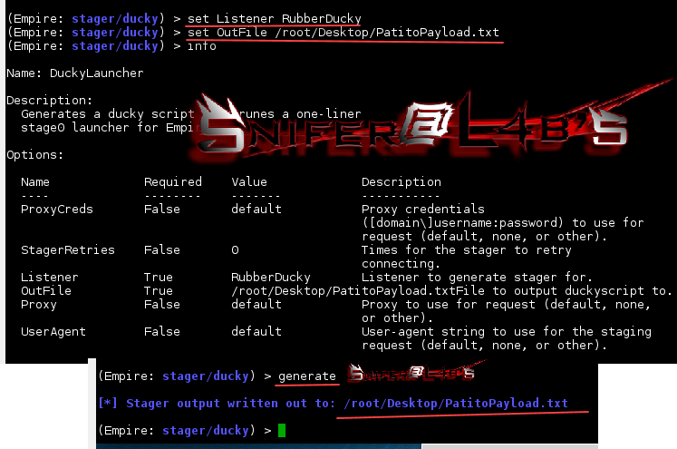 Notaran que al ejecutar el comando info en el framework nos da las opciones como lo tenemos en Metasploit con show options, si notan tenemos marcado el valor OutFile ademas de ello el Listener que debemos de especificar el creado con anterioridad en esta prueba es RubberDucky.