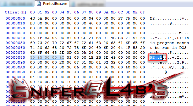 Como mencionamos tenemos que identificar la palabra PE y seguida de ella el siguiente valor L teniendo como resultado PE..L como se muestra en la siguiente captura, el ejecutable que procedo a analizar es PentestBox.exe