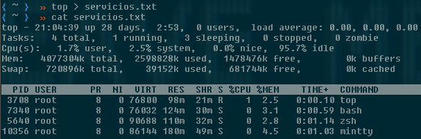 Redireccionamientos es trasladar el output de un lugar o estado a otro. Por ejemplo si deseamos almacenar en un archivo de texto los servicios que están corriendo actualmente podemos usar el comando:
