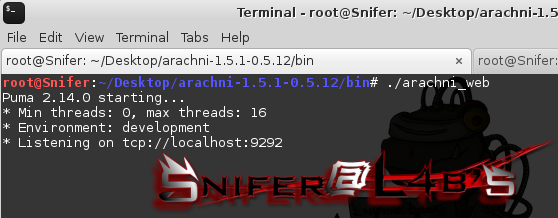 Como se mencionó anteriormente se cuenta con la interfaz Web, para ello procedemos a ejecutar en la terminal ./arachni_web teniendo en la terminal el inicio del servicio en el puerto 9292 como se muestra a continuación.