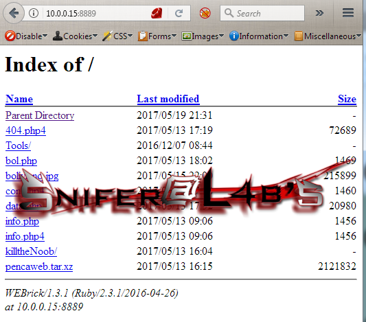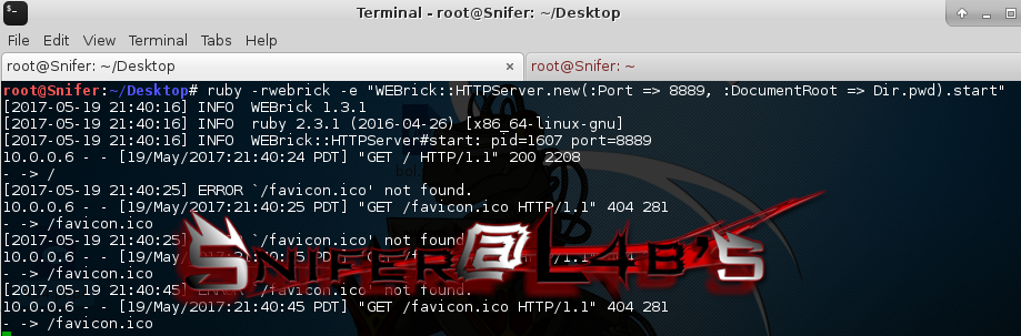 snifer@root:#ruby -rwebrick -e "WEBrick::HTTPServer.new(:Port => 8889, :DocumentRoot => Dir.pwd).start"