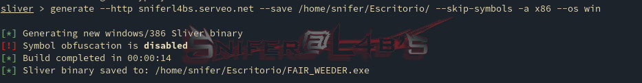 La generación de un sliver es el binario que debemos de hacer que se ejecute en nuestros objetivos para conocer un detalle de las diferentes opciones debemos de ejecutar help generate.