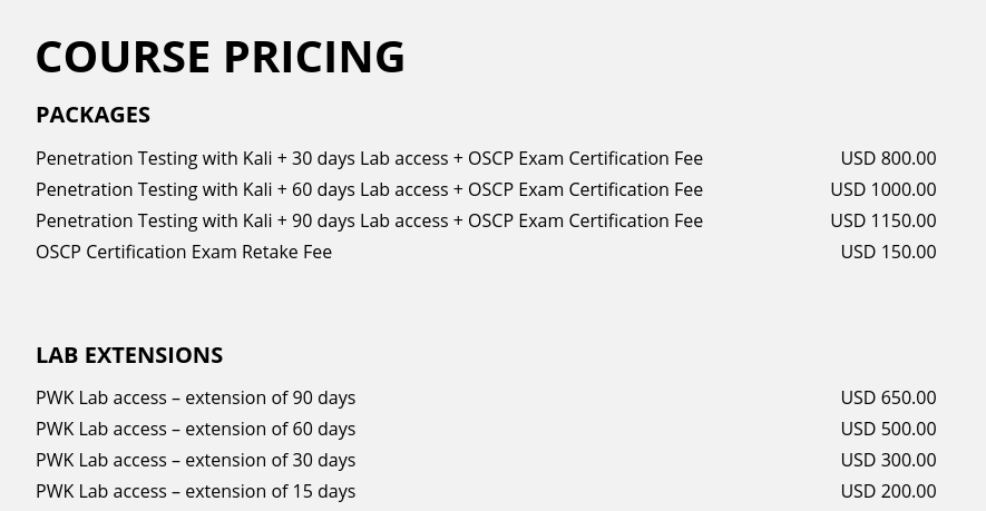 Es una de las certificaciones mas conocidas en el ámbito de seguridad informática, como todas las demás tiene un fin demostrar que tienes conocimiento del tema mediante un examen practico no teórico por lo cual permite evaluar tu capacidad y no solo responder preguntas, el costo de la certificación lo tienes a continuación cuando rendí el retake costaba 70 Dolares.