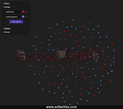 Los puntos rojos representan las charlas, los violeta a los ponentes, y los de color mostaza las etiquetas identificadas.