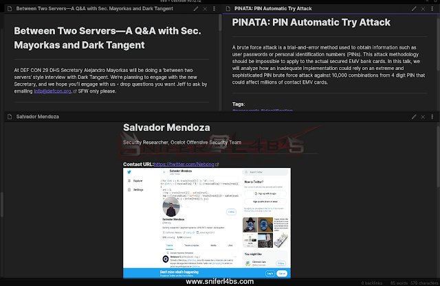 Para conocer de que van los temas de la DefCon de este año, opté por hacer uso de Web scraping y procesamiento de texto en python, realizando los siguientes pasos: extraer la información sobre las charlas desde su página web, etiquetarlo con las etiquetas registradas en security.stackexchange.com, tenerlo centralizo en un vault de Obsidian para generar los gráficos utilizando el Graph View de la herramienta.